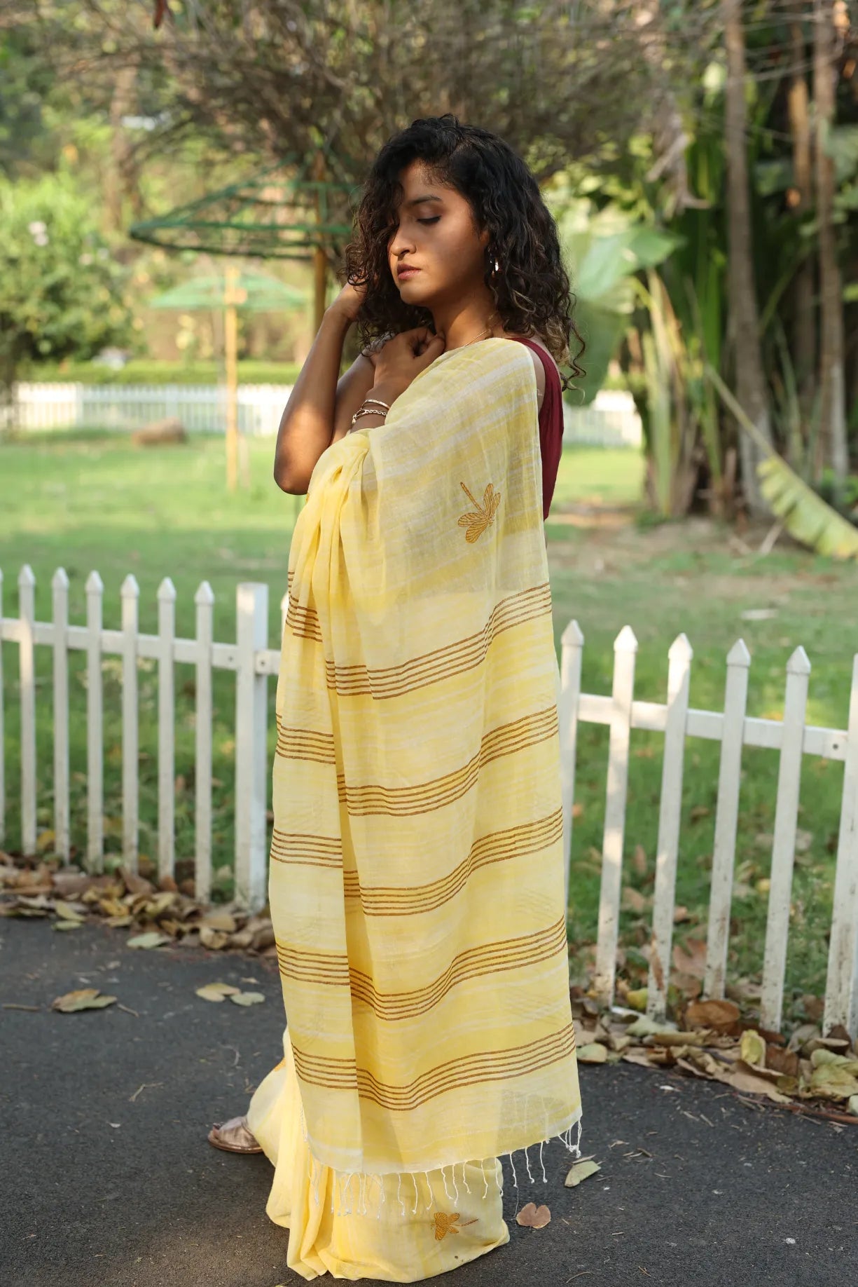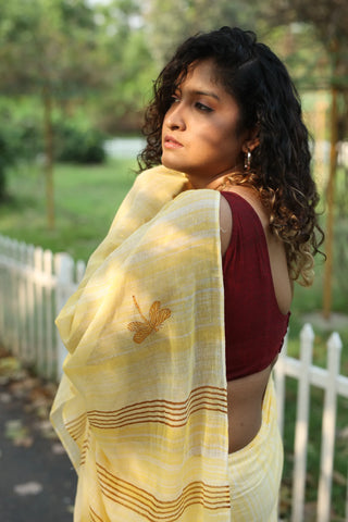 This yellow brush-dyed saree with our beloved dragonfly print accented with maroon stripes near the ‘pallu’ is surely made to complement this beautiful spring season!