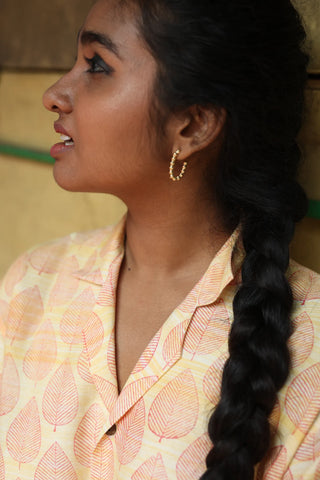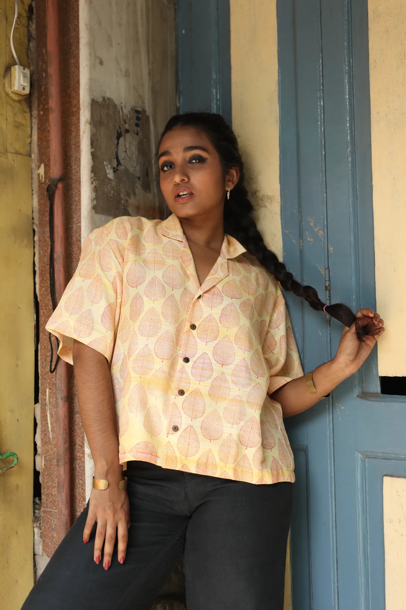 Notch collared shirt with half sleeves, made with hand-brush-dyed handloom bamboo fabric with all-over block prints.