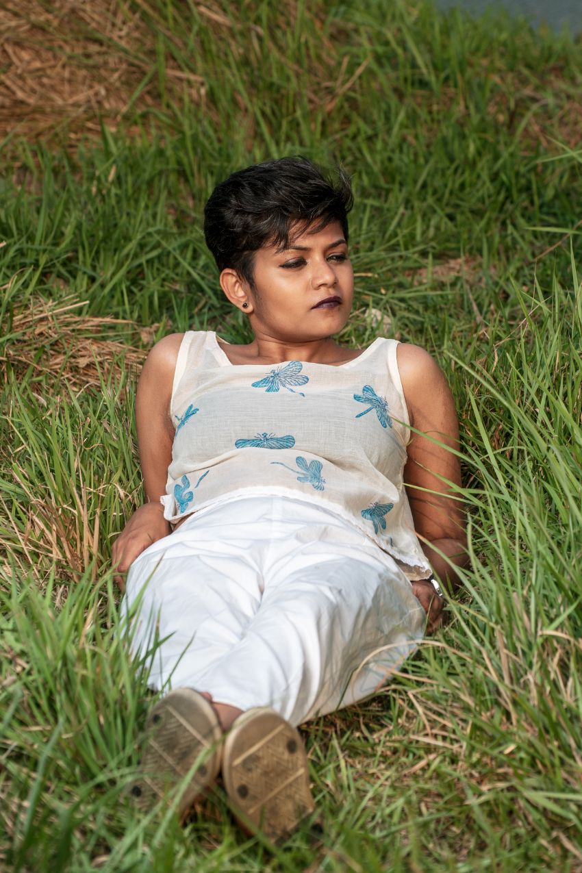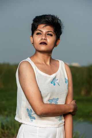 Dragonflies have been one of our favourite creatures. Blue on white mystic dragonflies flying around, scattered all over the crop top.