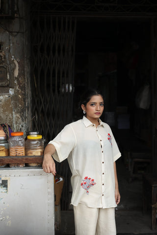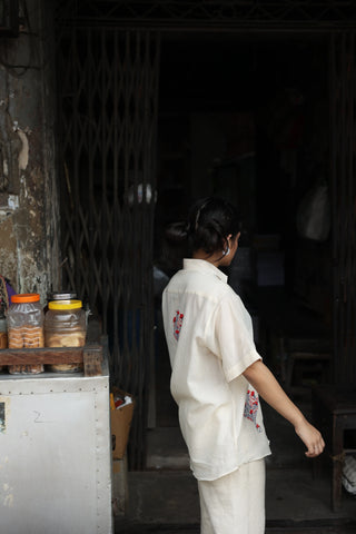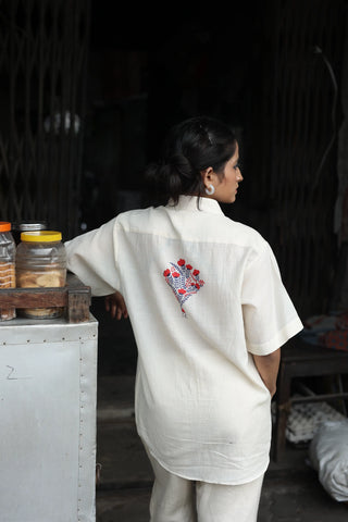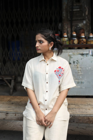 Basic buttoned-down shirt with half sleeves, with block print in the front and back, made with handloom organic cotton fabric.